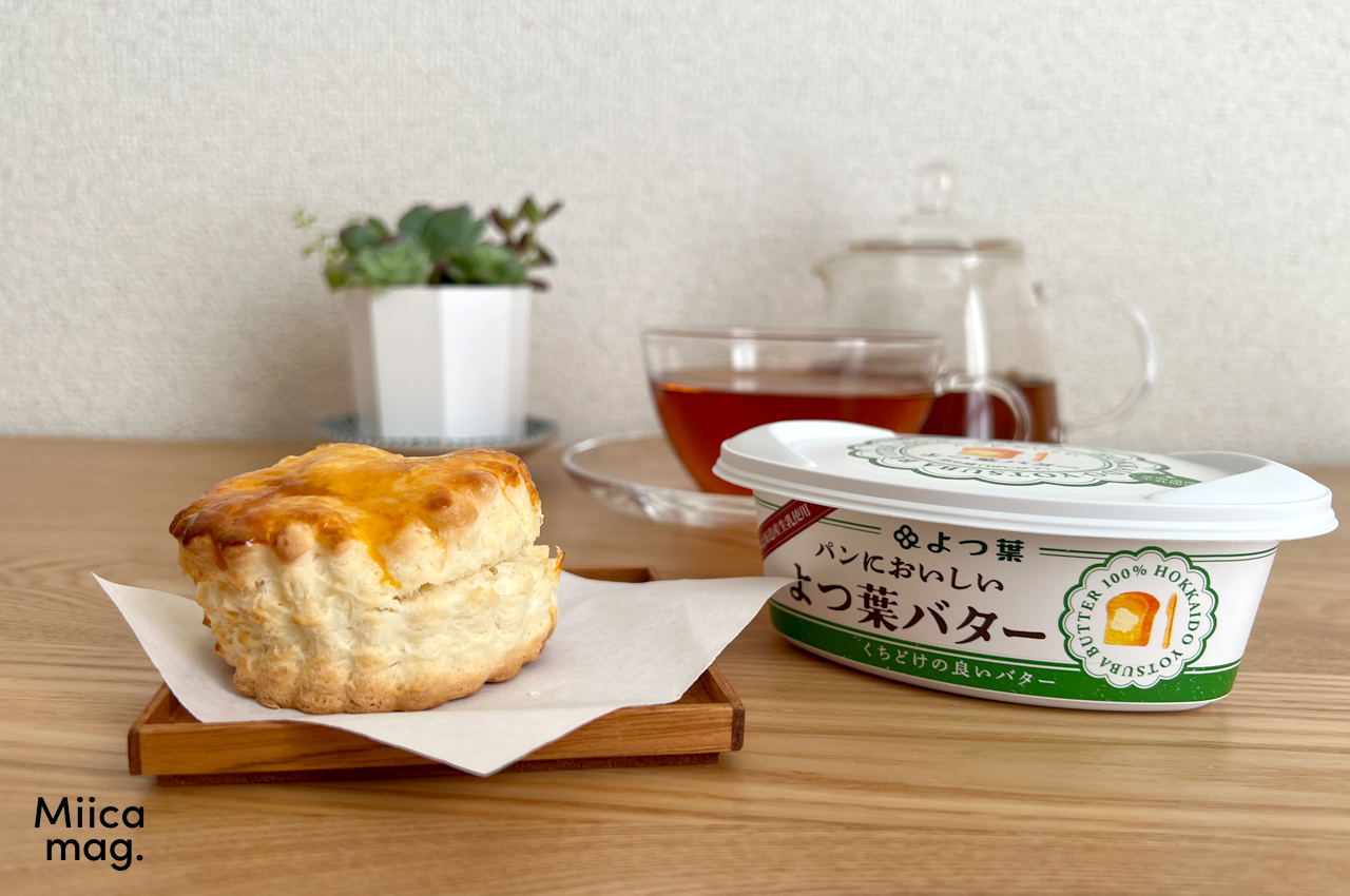 半分は何もつけずにスコーン本来のバターの風味で、残り半分はよつ葉バターを付けて。